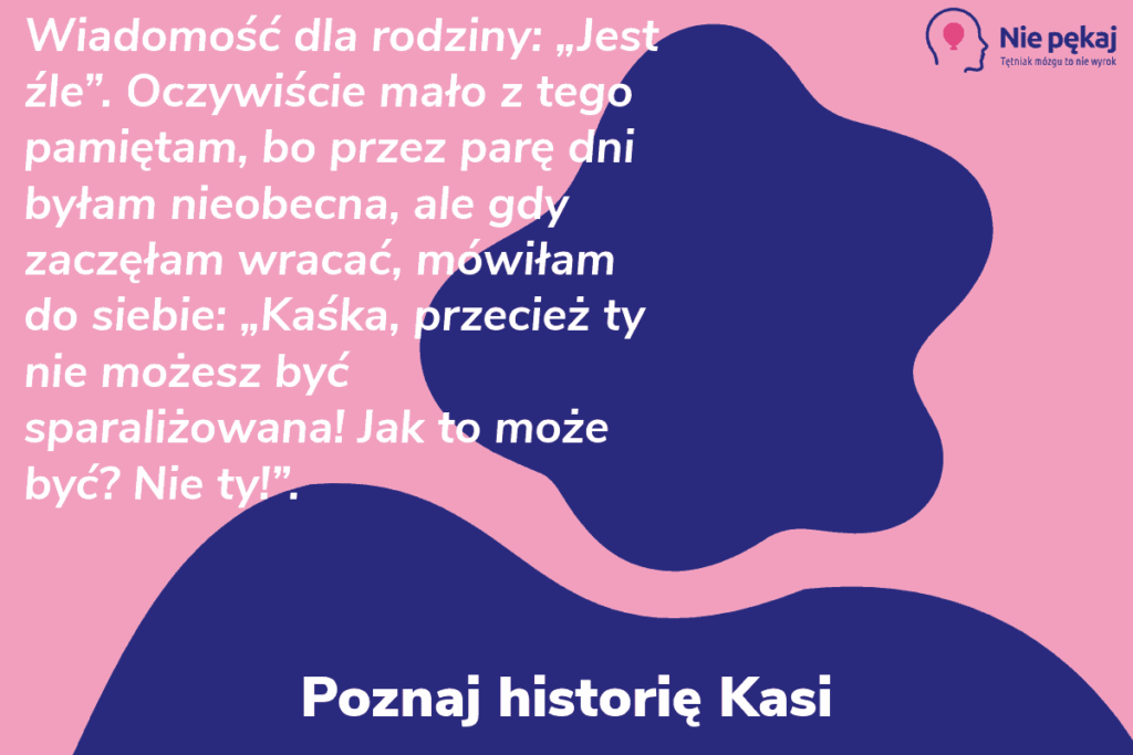 Oczywiście mało z tego pamiętam, bo przez parę dni byłam nieobecna, ale gdy zaczęłam wracać, mówiłam do siebie: „Kaśka, przecież ty nie możesz być sparaliżowana! Jak to może być? Nie ty!”.